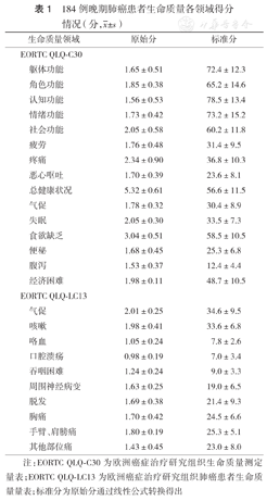 总之,EORTC QLQ-C30和QLQ-LC13作为医学评价方法,可全面评价疾病及治疗对患者造成的生理、心理和社会生活等方面的影响,治疗过程中应根据个体化的生命质量量表调查结果,针对性地采取干预措施,改善患者的生命质量和预后。
