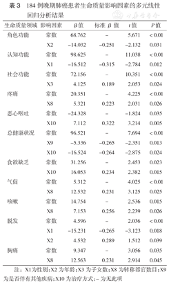 184例晚期肺癌患者生命质量影响因素的多元线性回归分析结果