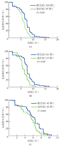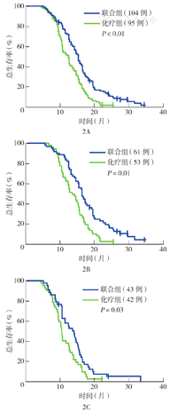 随访截至2019年6月30日。联合组的中位PFS时间为7.1个月(95%CI 6.8~7.5个月),化疗组为5.6个月(95%CI 5.1~6.1个月),差异有统计学意义(P<0.05)(图1A)。在65~74岁患者中,联合组与化疗组中位PFS时间分别为7.5个月(95%CI 7.4~7.6个月)和6.1个月(95%CI 5.3~6.3个月),差异有统计学意义(P<0.05)(图1B);在≥75岁患者中,联合组与化疗组中位PFS时间分别为6.4个月(95%CI 5.8~7.0个月)和5.4个月(95%CI 4.7~6.1个月),差异有统计学意义(P=0.04)(图1C)。联合组的中位OS时间为15.3个月(95%CI 14.2~16.4个月),化疗组为12.4个月(95%CI 10.8~14.0个月),差异有统计学意义(P<0.01)(图2A)。在65~74岁患者中,联合组和化疗组中位OS时间分别为16.4个月(95%CI 14.9~17.9个月)和13.5个月(95%CI 11.5~15.5个月),差异有统计学意义(P=0.01)(图2B);在≥75岁患者中,联合组和化疗组中位OS时间分别为14.1个月(95%CI 11.8~16.4个月)和10.5个月(95%CI 10.0~11.0个月),差异有统计学意义(P=0.03)(图2C)。