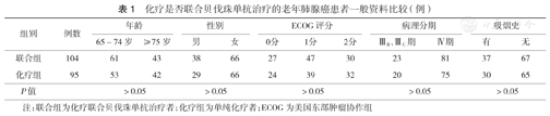 化疗是否联合贝伐珠单抗治疗的老年肺腺癌患者一般资料比较(例)
