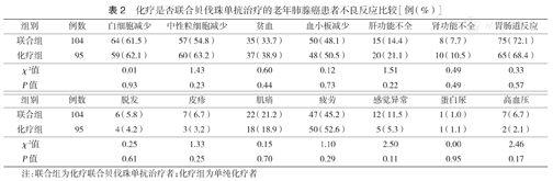 所有患者在治疗过程中最常见的不良反应是胃肠道反应、白细胞减少、中性粒细胞减少、贫血和血小板减少,两组各不良反应发生率差异均无统计学意义(均P>0.05)(表2)。联合组和化疗组≥Ⅲ级不良反应发生率分别为81.7%(85/104)和80.0%(76/95),差异无统计学意义(χ2=0.10,P=0.76)。两组均无致命性不良反应发生。