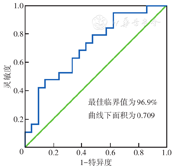 经ROC曲线分析,V5 Gy判断≥3级急性骨髓抑制发生的最佳临界值为96.9%,曲线下面积为0.709(图1),提示患者放疗计划中V5 Gy≥96.9%时更易发生≥3级急性骨髓抑制。V5 Gy为96.9%时,判断≥3级急性骨髓抑制发生的灵敏度、特异度、准确度、阳性似然比、阴性似然比分别为85.7%(18/21)、47.4%(9/19)、67.5%(27/40)、1.629、0.301。本组40例患者中,V5 Gy≥96.9%患者≥3级急性骨髓抑制的发生率高于V5 Gy<96.9%患者[75.0%(9/12)比35.7%(10/28)],差异有统计学意义(χ2=5.199,P=0.023)。