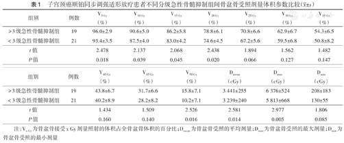 子宫颈癌顺铂同步调强适形放疗患者不同分级急性骨髓抑制组间骨盆骨受照剂量体积参数比较(