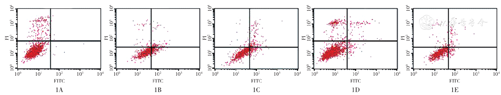 各组细胞经药物处理后,收集细胞至EP管,离心半径7.5 cm、2 000 r/min离心5 min,收集细胞。用不含EDTA的胰酶消化,离心半径7.5 cm、2 000 r/min离心5 min,弃培养液。预冷PBS洗涤细胞2次。再用400 µl 1×Binding Buffer悬浮细胞,细胞密度约为1×106/ml。在细胞悬浮液中加入5 µl Annexin V-FITC,轻轻混匀后2~8 ℃避光培养15 min。加入10 µl PI后轻轻混匀,2~8 ℃避光培养5 min。在1 h内采用流式细胞仪检测分析,计算细胞凋亡率。