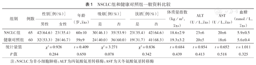 回顾性分析2019年1月至2020年6月我院收治符合标准的65例NSCLC患者临床资料。患者年龄52~87岁;TNM分期Ⅰ~Ⅱ期39例,Ⅲ~Ⅳ期26例;鳞状细胞癌28例,腺癌37例;淋巴结转移40例,无淋巴结转移25例。以同期60名健康体检者为健康对照组,年龄43~75岁。两组间一般资料比较,差异均无统计学意义(均P>0.05)(表1),具有可比性。本研究符合2013年修订的《赫尔辛基宣言》的要求,所有受试者和(或)其家属均签署知情同意书。