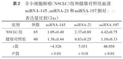 | 组别 | 例数 | miRNA-145 | miRNA-21 | miRNA-197 |