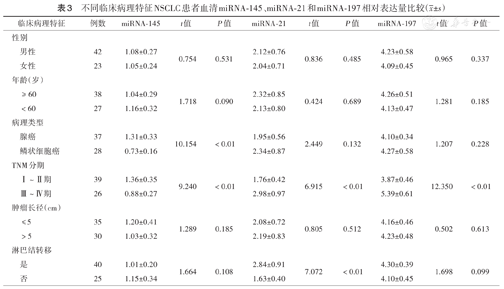| 临床病理特征 | 例数 | miRNA-145 | t值 | P值 | miRNA-21 | t值 | P值 | miRNA-197 | t值 | P值 | |