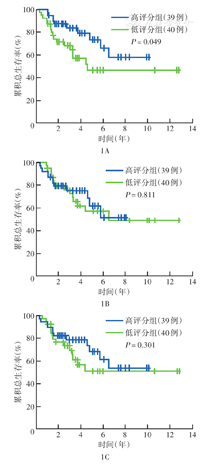 采用R语言软件ESTIMATE包计算得到79个样本的免疫评分、基质评分(二者即反映TME)和ESTIMATE评分[5]。分别以免疫评分、基质评分、ESTIMATE评分中位值为阈值,将患者分为高评分(≥中位值)组和低评分(<中位值)组。从基因表达综合(GEO)数据库下载GSE33371和GSE19750芯片数据集,采用R语言软件sva包对芯片数据进行批次校正,将该数据作为外部数据集,用于验证所构建的预后模型的预测效果。