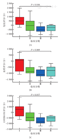 根据纳入的TCGA数据库中79例ACC患者的基因表达谱和临床数据计算,免疫评分、基质评分、ESTIMATE评分中位值分别为-190.51分(-1 179.24~1 980.65分)、-842.68分(-1 642.41~1 495.87分)、-942.77分(-2 766.65~3 441.57分),依据各评分中位值分组,各评分的高评分组均为39例,低评分组均为40例。各评分分组的Kaplan-Meier生存曲线显示,高、低免疫评分组ACC患者总生存差异有统计学意义(P<0.05)(图1A)。高、低基质评分和ESTIMATE评分组间总生存差异均无统计学意义(均P>0.05)(图1B、图1C)。临床分期Ⅰ~Ⅲ期患者免疫评分、基质评分和ESTIMATE评分均逐渐降低,Ⅰ~Ⅳ期患者间免疫评分和ESTIMATE评分差异均有统计学意义(均P<0.05),但基质评分差异无统计学意义(P>0.05)(图2)。