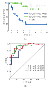 免疫评分和基质评分中的1 205个DEG中,有684个存在于GEO数据集中。采用survival包,对684个候选基因进行单因素Cox回归分析,筛选出与预后相关的121个差异基因。通过绘制差异基因患者的Kaplan-Meier生存曲线,筛选出生存曲线中P<0.05的49个基因。对49个差异基因进行lasso回归分析,最终获得与预后相关的14个候选基因。将14个候选基因纳入双向逐步多因素Cox回归分析中,得到包含9个TME相关基因的ACC预后模型:RS=GREB1×0.223 6+POU4F1×0.671 7+HIC1×0.167 5+HOXC9×0.211 3+CACNB2×0.156 0+RAB27B×0.956 5+ZIC2×0.582 7+C3×(-0.003 1)+ CYP2D6×0.819 3(表1)。RS中位值为0.617 4分,依此将79例ACC患者分为RS低评分组(RS<0.617 4分,40例)和RS高评分组(RS≥0.617 4分,39例)。Kaplan-Meier生存曲线显示,RS高评分组患者总生存不良(P<0.05)(图3A)。绘制RS预测1、3、5年患者总生存的ROC曲线,曲线下面积(AUC)分别为0.876、0.919、0.917(图3B),提示该模型对生存结果的预测准确性较高。