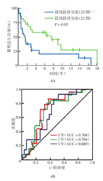 从GEO数据库下载GSE33371和GSE19750芯片数据集中ACC患者资料,分别有23、22例,依据预测模型,对此45例患者生存进行分析。Kaplan-Meier生存曲线分析显示,建立的预后模型高、低RS组间总生存差异有统计学意义(P<0.05)(图4A)。绘制RS预测ACC患者1、3、5年总生存的ROC曲线,AUC分别为0.689、0.704、0.708(图4B),提示该模型对生存具有较好的预测性能。