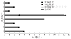 8例患者中男性5例,女性3例。8例患者中,1例部分缓解(PR),1例疾病稳定(SD),6例疾病进展(PD);客观缓解1例,疾病控制2例。中位PFS时间为2.0个月(95% CI 0.6~3.4个月),中位OS时间为3.5个月(95% CI 2.2~4.8个月)。主要不良反应为乏力(3例),皮疹、甲状腺功能亢进、甲状腺功能减退、尿路感染、高尿酸、高血糖、肾功能不全各1例。患者的不良反应主要为1~2级,未发生3~4级不良反应,经对症治疗好转。