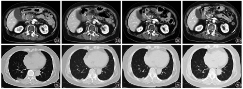 (1)获得SD的患者为女性,64岁,2019年9月行胰腺癌手术,术后行放疗,后复查未见复发。2020年7月确诊为胰腺癌术后肠系膜上动脉周围转移,8月开始予信迪利单抗治疗。经信迪利单抗联合白蛋白结合型紫杉醇规律用药6个周期,疗效评价为SD,后予信迪利单抗单药维持治疗2个周期。至末次治疗(2021年4月2日),仍处于SD状态;不良反应主要为1级乏力,未影响治疗。(2)获得PR的患者为女性,74岁,2019年4月确诊为胰腺癌伴肺、淋巴结转移,无手术适应证,予局部姑息放疗后经多线化疗后进展。2020年4月开始予信迪利单抗治疗,治疗不规律,经信迪利单抗治疗2个周期后,腹泻症状明显好转,肿瘤指标CA199从645.0 U/ml降至80.2 U/ml,病灶缩小47.6%,疗效评价为PR。应用信迪利单抗治疗至末次治疗(2021年4月30日)期间,出现一系列不良反应,包括皮疹、甲状腺功能亢进、甲状腺功能减退、尿路感染、高尿酸、高血糖、肾功能不全,皆为1~2级,经对症治疗后好转。患者处于持续缓解中。该患者信迪利单抗治疗期间肿瘤相关指标及不良反应变化情况见表1,信迪利单抗治疗前后胸部及腹部病灶影像学变化见图2。