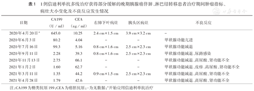 1例信迪利单抗多线治疗获得部分缓解的晚期胰腺癌伴肺、淋巴结转移患者治疗期间肿瘤指标、病灶大小变化及不良反应发生情况