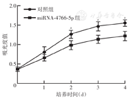 注:miRNA-4766-5p组为转染表达miRNA-4766-5p质粒的OC3细胞;对照组为转染阴性对照质粒的OC3细胞;两组样本数均为4;以吸光度值表示细胞增殖能力;与对照组比较,aP<0.05