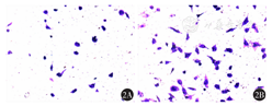 使用无血清培养液稀释Matrigel胶,向Transwell小室中加入60 μl Matrigel胶并凝固。取对照组和miR-4766-5p组OC3细胞,胰酶消化制备单细胞悬液,加入200 μl(4×104)细胞悬液至Transwell小室的上室,下室加入含10%胎牛血清的RPMI 1640培养液。培养24 h后取出上室,用棉棒擦去未穿胶的细胞。采用甲醇溶液固定,0.1%结晶紫染色,100倍光学显微镜下计数穿胶细胞数并拍照。实验重复4次。