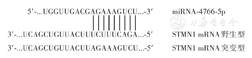 注:STMN1为微管去稳定蛋白1;miRNA-4766-5p组为转染表达miRNA-4766-5p质粒的OC3细胞;对照组为转染阴性对照质粒的OC3细胞