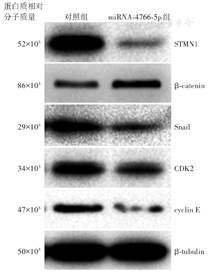 蛋白质印迹法检测结果显示,与对照组相比,miR-4766-5p组OC3细胞STMN1蛋白表达降低,上皮细胞表型蛋白β-catenin表达升高,间质细胞表型蛋白Snail表达降低,细胞周期蛋白CDK2、cyclin E表达均降低(图4)。