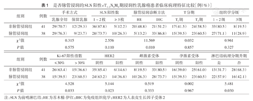 是否脉管浸润的SLN阳性cT1~2N0M0期浸润性乳腺癌患者临床病理特征比较[例(%)]