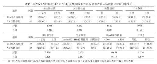 | NSLN转移组 | 42 | 29(69.0) | 13(31.0) | 32(76.2) | 7(16.7) | 3(7.1) | 20(47.6) | 22(52.4) | 31(73.8) | 11(26.2) |