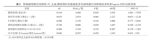 影响前哨淋巴结阳性cT1~2N0M0期浸润性乳腺癌患者非前哨淋巴结转移的多因素logistic回归分析结果
