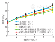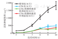 注:CTX为环磷酰胺;核糖核酸Ⅱ为注射用核糖核酸Ⅱ的简称;模型组为接种肿瘤细胞但未经药物干预的小鼠;各给药组相应地于接种肿瘤细胞24 h后开始腹腔注射低剂量(25 mg/kg,1次/d)或中剂量(50 mg/kg,1次/d)核糖核酸Ⅱ,于接种肿瘤细胞48 h后开始腹腔注射CTX(25 mg/kg,1次/2 d),共给药10 d;模型组腹腔注射等体积0.9% NaCl溶液