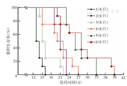 开始给药当天起称量小鼠体质量,1次/2 d,至该组剩余小鼠少于6只时停止称量。计算小鼠体质量增长率。给药至小鼠全部死亡,记录各组小鼠死亡日期,待实验结束后计算生命延长率并绘制生存曲线。治疗效果的判断依据抗肿瘤药物药效学实验方法及指导原则:生命延长率<75%为无效;生命延长率≥75%,并与模型组比较,差异有统计学意义(P<0.05),且模型组20%动物生存时间未超过4周时为有效。