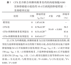 CTX是否联合核糖核酸Ⅱ给药的肉瘤细胞S180实体移植瘤小鼠给药10 d后剥离的肿瘤质量及抑瘤率比较