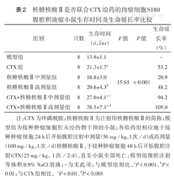 综上,核糖核酸Ⅱ联合CTX可显著延长肉瘤细胞S180荷瘤小鼠生存时间,提高抑瘤率,改善生命质量,二者发挥协同增效作用,这对核糖核酸Ⅱ在临床抗肿瘤治疗中的应用具有指导意义。