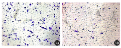 取两组HCC94细胞,按照细胞密度1×105/ml接种至Transwell小室上室,下室中加入含10%胎牛血清的培养液。培养箱中培养24 h,3%多聚甲醛溶液固定25 min,0.3%结晶紫溶液染色25 min,在100倍倒置显微镜下观察细胞,统计穿胶细胞数。