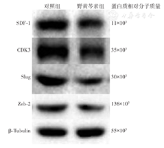 蛋白质印迹法检测结果显示,野黄芩素促进miR-496表达后,SDF-1蛋白、细胞增殖蛋白CDK3、细胞迁移蛋白Slug和Zeb-2表达均降低(图4)。