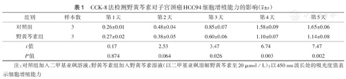 CCK-8法检测结果显示,培养第3、4、5天,与对照组比较,野黄芩素组HCC94细胞增殖能力均降低(均P<0.05),表明野黄芩素可抑制HCC94细胞的增殖能力(表1、图2)。