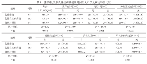 乳腺癌、乳腺良性疾病及健康对照组人口学及病史特征比较