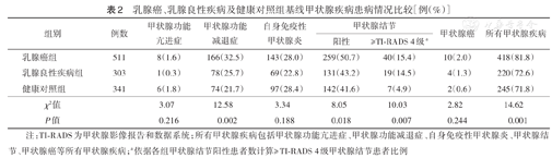 乳腺癌、乳腺良性疾病、健康对照3组间比较,甲状腺功能亢进症、自身免疫性甲状腺炎、甲状腺癌患病率差异均无统计学意义(均P>0.05),甲状腺功能减退症、甲状腺结节、甲状腺影像报告和数据系统(TI-RADS)4级及以上甲状腺结节及所有甲状腺疾病的患病率差异均有统计学意义(均P<0.05)(表2)。