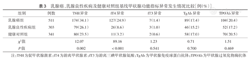 乳腺癌、乳腺良性疾病、健康对照3组间基线TSH、fT4异常发生情况比较,差异均有统计学意义(均P<0.01),fT3、TgAb、TPOAb异常发生情况比较,差异均无统计学意义(均P>0.05)(表3)。