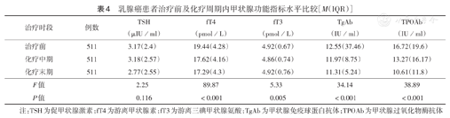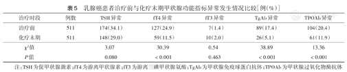 综上所述,本研究结果提示乳腺癌与甲状腺疾病有关。乳腺癌患者甲状腺功能减退症、甲状腺结节和TI-RADS 4级及以上甲状腺结节的患病率较健康人高,TSH和fT4异常率亦较高。乳腺癌患者化疗周期内fT4、fT3、TgAb和TPOAb水平差异均有统计学意义,化疗结束时fT4、TgAb、TPOAb异常率均低于治疗前。因此,临床医生在乳腺癌治疗及随访过程中,应密切关注患者甲状腺疾病及甲状腺功能的变化,以便尽早发现,及时对甲状腺疾病进行规范化治疗。此外,为了更好地了解乳腺癌与甲状腺疾病的关系,还需长时间和大样本的研究进行探讨。