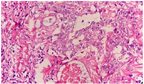 患者,男性,26岁。2020年5月出现咳嗽、胸闷、肩背部疼痛,6月19日就诊于我院。PET-CT示:右侧胸前恶性占位,大小为16.7 cm×15.1 cm×22.3 cm,右侧胸膜及纵隔多发淋巴结转移。肿瘤标志物:甲胎蛋白(AFP)36 343 ng/ml,β人绒毛膜促性腺激素(β-HCG)<2.0 mU/ml。2020年6月20日行CT引导下胸部肿块穿刺活组织检查,病理结果示:卵黄囊瘤。免疫组织化学:AFP、CK阳性,Ki-67阳性指数为50%。2020年6月开始行姑息一线第1~4个周期ABX+EP方案化疗:白蛋白结合型紫杉醇125 mg/m2 ,第1、8天;依托泊苷100 mg/m2,第1天至第5天;顺铂20 mg/m2,第1天至第5天;每3周重复。4个周期后影像学评价为部分缓解(PR),AFP 3 084 ng/ml。2020年10月于胸外科行纵隔肿物姑息性切除术,术后病理诊断为卵黄囊瘤(图1)。免疫组织化学:AFP、CK、PLAP、SALL4阳性,CD117、OCT-4阴性,Ki-67阳性指数为50%。因上腔静脉血栓,每日口服利伐沙班片(拜瑞妥)10 mg,每日1次。2020年11月(术后1个月)出现疾病进展(PD),AFP 54 678 ng/ml。因既往化疗有效,2020年11月至2021年1月行第5~7个周期ABX+EP方案化疗,剂量同前。同时加用安罗替尼12 mg/d,第1天至第14天口服,每3周重复。患者治疗7个周期后影像学检查评价疗效为PR(图2),AFP 3 955 ng/ml。2021年1月因纳差、消瘦要求暂停静脉注射化疗,仅口服安罗替尼,剂量同前。安罗替尼口服过程中,未出现骨髓抑制、肝肾功能损害、高血压及出血等不良反应。2021年3月复查提示PD,AFP 46 869 ng/ml。于3月30日开始安罗替尼+TIP方案治疗:安罗替尼12 mg/d,第1天至第14天口服;白蛋白结合型紫杉醇125 mg/m2,第1、8天;异环磷酰胺1.8 g/m2,第1天至第4天;顺铂20 mg/m2 ,第1天至第4天;每3周重复,共2个周期,疗效评价为PR,AFP 5 155 ng/ml。后因个人原因要求再次停止静脉注射化学治疗。5月27日至7月2日行局部放疗,以右前纵隔占位为肿瘤体积,照射剂量5 000 cGy,25次,共5周。放疗期间同期口服安罗替尼,剂量同前。8月10日出现额叶大面积脑出血及昏迷,安罗替尼已停药4 d,当天测得凝血酶原时间(PT)17.5 s,活化部分凝血活酶时间(APTT)35.5 s,D-二聚体4.97 s,考虑利伐沙班片致脑出血可能性大,不排除与安罗替尼相关,予停用利伐沙班片,转入神经外科治疗,于2021年9月死于呼吸衰竭。