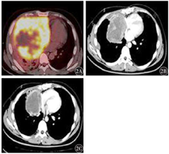原发纵隔卵黄囊瘤多位于前纵隔,起病隐匿,常发生转移,尤其易转移至邻近组织和器官,如心包、肺、纵隔内大血管等,且易复发[2]。卵黄囊瘤血清AFP升高,但β-HCG一般不升高,也可作为相对特异性诊断指标[3]。CT和磁共振成像(MRI)对原发纵隔卵黄囊瘤有很好的诊断价值,可以评价有无远处转移及与周围组织关系,评估肿瘤的可切除性。但影像学结果难以和其他原发于纵隔的肿瘤相鉴别,如原发纵隔淋巴结或胸腺瘤。且因卵黄囊瘤具有异质性,可与其他生殖细胞肿瘤混合,因此在接受治疗前,患者均需接受穿刺活组织检查以明确病理诊断[4]。