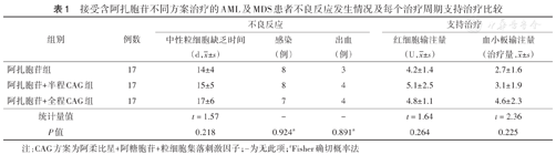 | 阿扎胞苷+全程CAG组 | 17 | 17±6 | 7 | 4 | 4.8±1.1 | 4.6±2.3 |