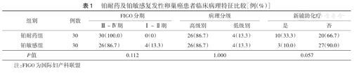 | 铂耐药组 | 30 | 30(100.0) | 0(0) | 26(86.7) | 4(13.3) | 10(33.3) | 20(66.7) |