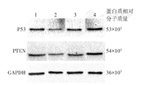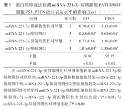 蛋白质印迹法检测miRNA-221-3p对胰腺癌PATU8988T细胞P53、PTEN蛋白表达水平的影响(