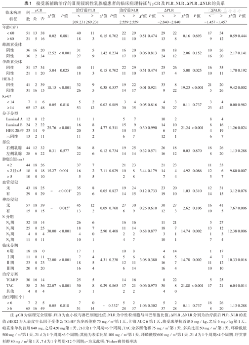 | 临床病理特征 | 例数 | pCR | χ2值 | P值 | 治疗前PLR | χ2值 | P值 | 治疗前NLR | χ2值 | P值 | ΔPLR | χ2值 | P值 | ΔNLR | χ2值 | P值 | ||||||