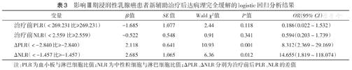 ΔPLR、ΔNLR与患者新辅助治疗后达pCR相关(均P<0.05)(表2)。logistic回归分析显示,ΔPLR、ΔNLR是患者治疗后pCR的影响因素(表3)。