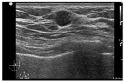 患者,男性,65岁,因右侧乳腺癌术后13年,左侧乳腺肿物10 d于2021年1月入我院。入院前当地医院行超声检查示:左侧乳腺体内低回声影,未行特殊治疗。患者高血压病史30年,血压最高200 mmHg/95 mmHg(1 mmHg=0.133 kPa),冠心病史1年,平时规律服用药物,日常控制尚可。糖尿病史3年,未行规律治疗。骨关节炎病史8年,未行特殊治疗。患者有乳腺癌家族史。查体:右乳缺如,有陈旧性手术瘢痕;左侧乳头未见脱屑,无内陷,无溢液;左侧乳房外上象限可扪及一肿物,距离乳头3 cm,大小约2 cm×2 cm,质硬,边界不清,活动度差,伴压痛;双侧腋下及锁骨上未扪及肿大淋巴结。超声检查见:右侧乳腺术后右侧胸壁未见明显占位性病变;左侧乳腺1点方向紧邻乳头旁可见低回声结节,大小0.9 cm×0.9 cm×1.0 cm,边界尚清,形态不规则,内回声不均匀,彩色多普勒血流成像(CDFI)检查示条状血流信号(图1)。超声提示:左侧乳腺实性结节BI-RADS 4A类。各项肿瘤标志物水平正常。患者行全身骨显像检查示:双膝关节代谢增高,考虑关节炎;无其他异常。