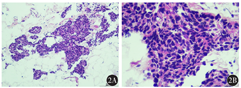 患者入我院后,在全身麻醉下行单侧乳腺癌改良根治术+腋窝淋巴结清扫术,术中将肿瘤完整切除送冰冻病理示:(左侧乳腺肿物)浸润性癌,手术切缘未见癌细胞累及。术后病理示:(左侧乳腺)浸润性癌,非特殊型,Ⅱ级,肿瘤大小1.5 cm×1.0 cm×1.0 cm,未见脉管内瘤栓及癌组织侵犯神经现象。左侧乳腺癌组织学检查示:癌细胞呈腺管样或单个散在弥漫浸润周围脂肪组织(图2A),癌细胞边界不清,可见核分裂象(图2B)。腋窝17个淋巴结未见癌组织转移。免疫组织化学检查示:ER 80%阳性、PR 15%阳性、Ki-67 50%阳性,人表皮生长因子受体2(HER2)、E-cadherin、EMA、GATA3均阳性,p120膜阳性,p53野生型,D2-40淋巴管阳性、瘤栓阴性,GCDFP-15弱阳性,mammaglobin弱阳性,AR、p63、CD117、SMMHC、表皮生长因子受体(EGFR)、calponin、CK5/6均阴性,CD34血管阳性、瘤栓阴性。程序性死亡受体配体1(SP142)表达检测示:免疫细胞评分0%。肿瘤无异质性。荧光原位杂交(FISH)检测结果示:计数20个细胞,HER2基因信号点状分布;CEP17染色体信号平均2.1;HER2信号平均2.3;HER2与CEP17比值为1.1。患者术后恢复良好,术后采用环磷酰胺+多西他赛方案治疗:多西他赛注射液120 mg,注射用环磷酰胺1 g,化疗3次。监测乳腺癌肿瘤标志物未见异常。3次静脉注射化疗药物后,患者无法耐受恶心、呕吐等消化道不良反应,恢复相对缓慢,遂放弃化疗。