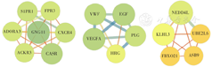 采用STRING数据库构建差异表达mRNA的PPI(PPI富集P<0.001)。选择结合置信度高(>0.9)的筛选条件,得到包含654个蛋白的PPI。用Cytoscape软件筛选得到重要功能模块,其中包括信号转导模块、生长因子模块、蛋白泛素化模块等(图2)。