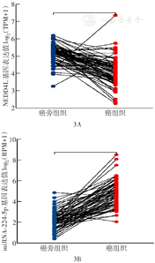 用Oncomir数据库对显著差异表达的miRNA(|log2FC|>3,P<0.05)进行筛选,结果显示有3个关键miRNA与肾透明细胞癌的预后和进展显著相关,分别为miR-224-5p、miR-138-5p、miR-885-5p。其中miR-224-5p与肾透明细胞癌进展关系最紧密(t检验的P值最小),且在肿瘤组织中高表达。