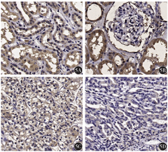 qRT-PCR结果显示,在肾透明细胞癌与配对癌旁组织中,NEDD4L mRNA相对表达量分别为0.138±0.103、1.000±0.026(t=46.23,P<0.05);miR-224-5p相对表达量分别为1.000±0.043、0.129±0.108(t= 45.28,P<0.05)。病理分级Ⅰ~Ⅱ级、Ⅲ~Ⅳ级患者NEDD4L mRNA相对表达量分别为0.033±0.017、0.161±0.100(t=3.07,P<0.05);miR-224-5p相对表达量分别为0.281±0.126、0.096±0.069,(t=5.14,P<0.05);T分期Ⅰ~Ⅱ期、Ⅲ~Ⅳ期患者NEDD4L mRNA相对表达量分别为0.027±0.012、0.167±0.097(t=3.75,P<0.05);miR-224-5p相对表达量分别为0.293±0.099、0.086±0.055(t=7.43,P<0.05)。不同年龄及性别间NEDD4L mRNA、miR-224-5p相对表达量差异均无统计学意义(均P>0.05)。蛋白质印迹法检测结果显示,与癌旁组织相比,NEDD4L蛋白在肾透明细胞癌组织中表达水平降低。IHC结果显示,与癌旁组织相比,NEDD4L蛋白在正常肾组织中表达水平升高,在肾透明细胞癌中表达水平降低;与病理分级Ⅰ级肾透明细胞癌组织相比,病理分级Ⅲ级肾透明细胞癌组织NEDD4L表达水平更低(图5)。