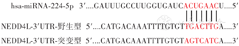 双荧光素酶报告基因实验结果显示,WT-NEDD4L+ miR-224-5p模拟物组荧光素酶活性较WT-NEDD4L+miR-NC组降低(0.462±0.027比1.000±0.023),差异有统计学意义(t=55.80,P<0.05);MUT-NEDD4L+ miR-224-5p模拟物组荧光素酶活性与MUT-NEDD4L+ miR-NC组比较(0.996±0.067比1.000±0.015),差异无统计学意义(t=0.18,P=0.863)。miR-224-5p与NEDD4L的靶向结合模式见图6。