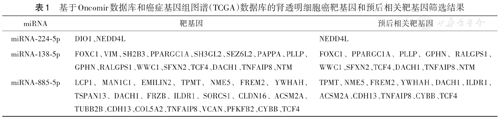 基于Oncomir数据库和癌症基因组图谱(TCGA)数据库的肾透明细胞癌靶基因和预后相关靶基因筛选结果